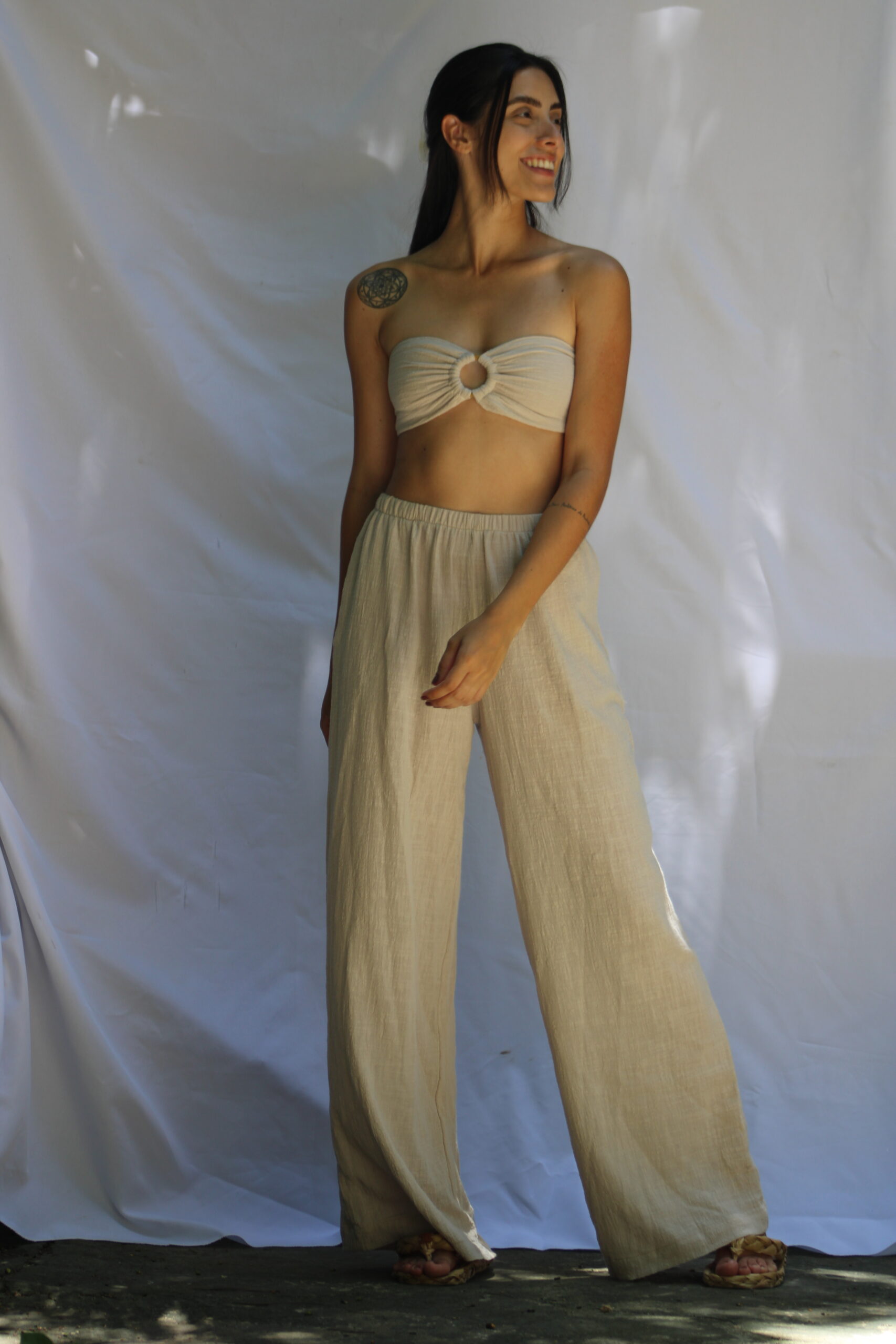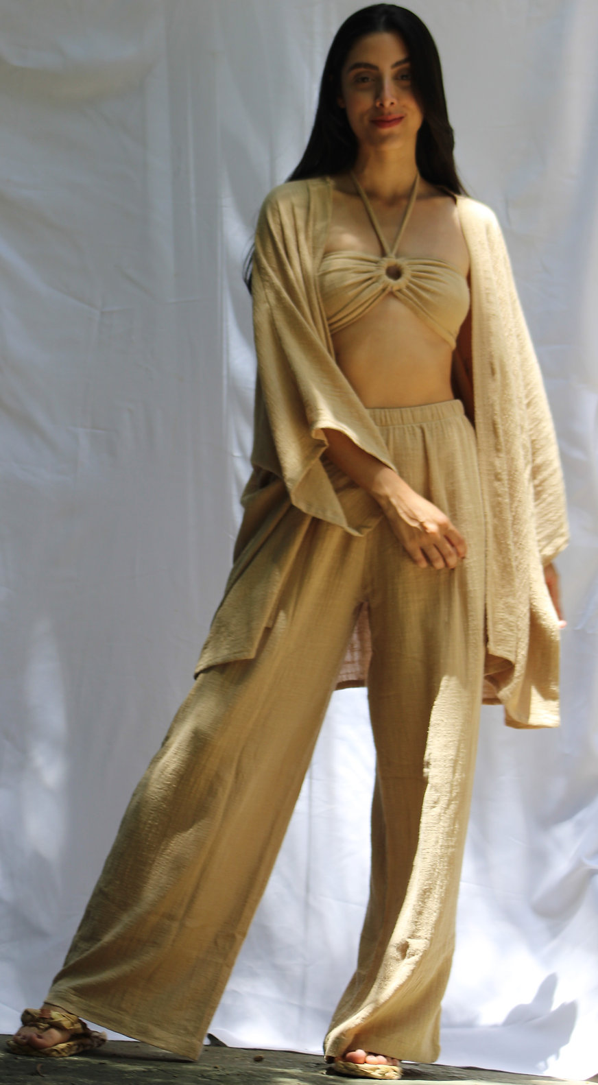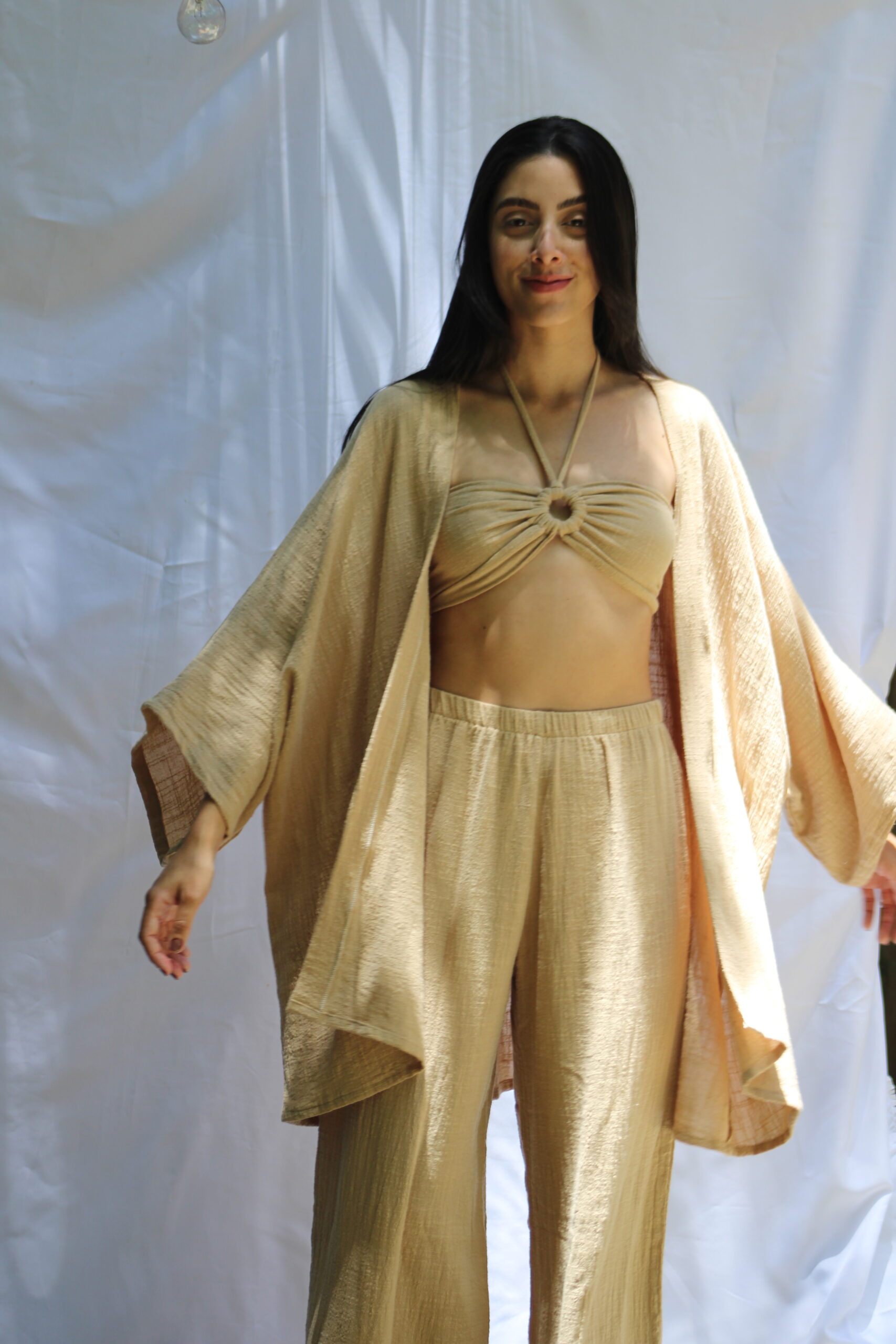 Confeccionada em gaze de algodão, tecido de gramatura leve e fina, que acompanha com naturalidade os movimentos do dia.