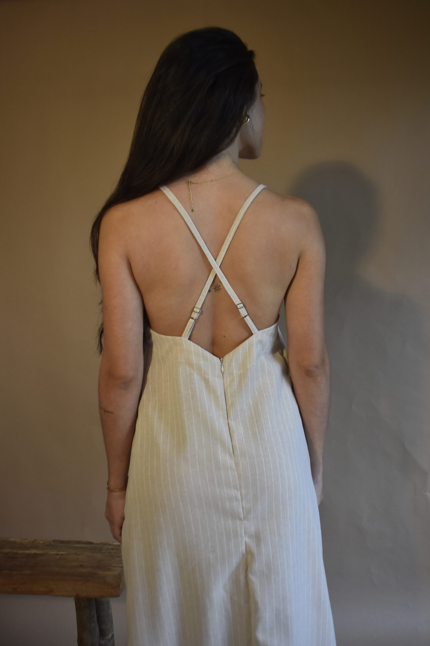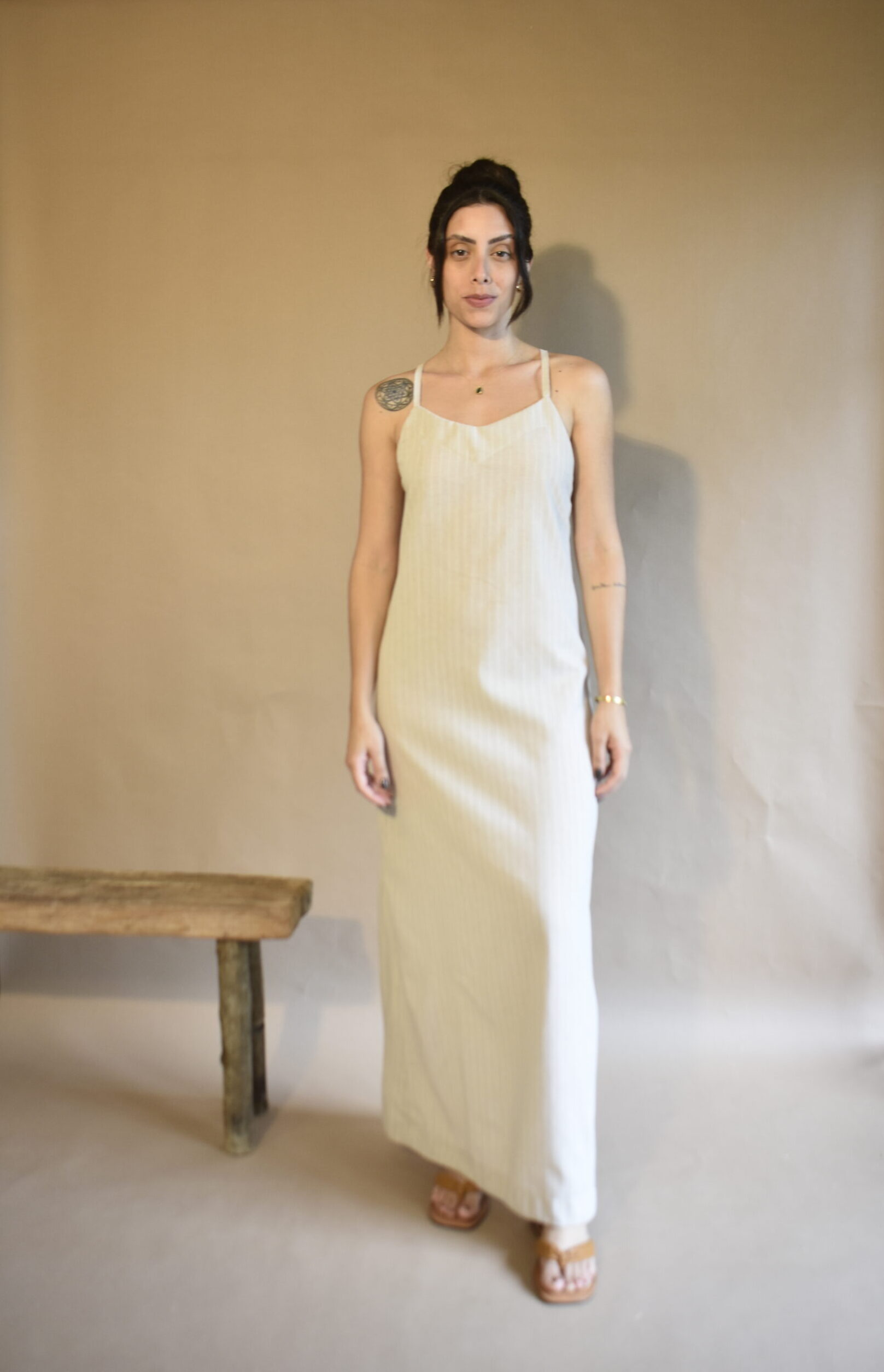 Vestido confeccionado no linho listra, produzido em grade reduzida de 6’UN.